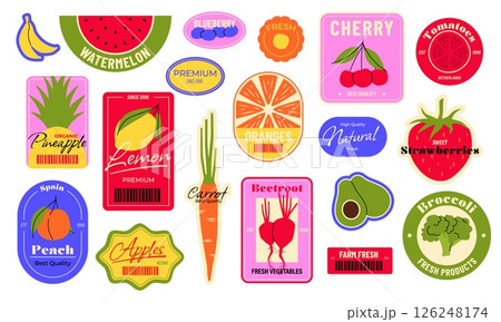 Food fruit label. Cartoon stickers with organic tropical berry apple banana cherry citrus, fresh natural badges with fruits and berries for supermarket. Vector market stickers set