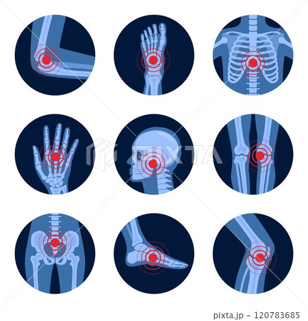 Parts of human body on x ray view. Different x-rays shot of human body parts with skeleton pain points. Chronic anatomy body injury in circle shape. Vector illustration.