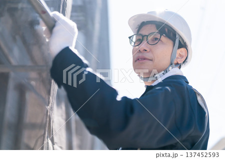 大規模修繕工事の現場で働く眼鏡の足場とび職人