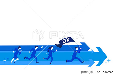 DXの旗を持つリーダーと走るビジネスマン、DX推進のイメージイラスト
