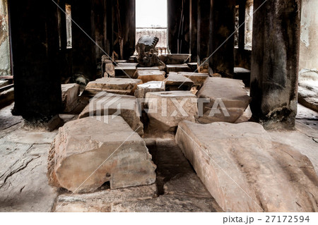 崩れた石が散乱し、修復されないで放置されているアンコール・ワットの経蔵内