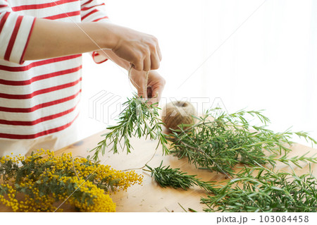 ドライハーブを作る女性の写真