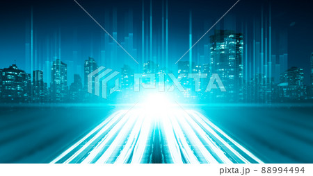 Futuristic City Building Skyline. Traffic light trail to Cityscape.