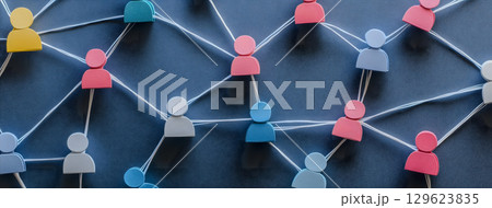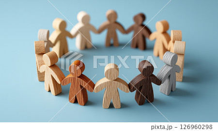 様々な木材で作られた人型が手を繋ぐ温かなチームワーク | ナチュラルな質感