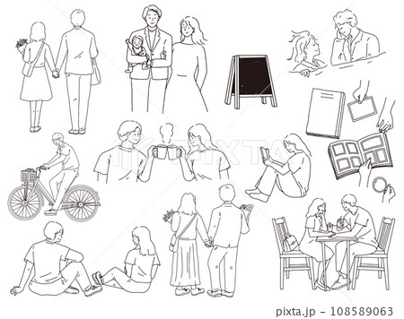 白黒、線画のイラスト(結婚式、カップル、夫婦、子供の成長過程、出会い、幸せ、自己紹介、招待状)