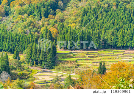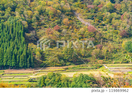 東秋山林道から見た秋の新潟県津南町秋山郷結東の石垣田