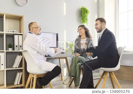 Doctor consulting couple at appointment in bright clinic office, healthcare advice