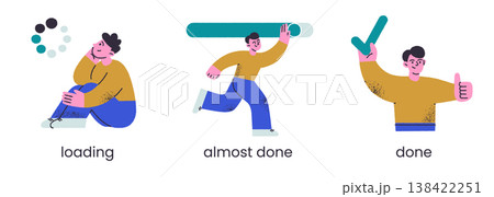 Loading progress bar scene set, flat cartoon man waiting and watching progress, almost done and completed states. Done character holding big checkmark, empty state vector illustration