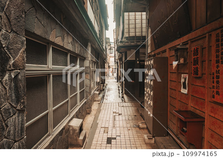 渋大湯・男湯入口と銭洗い温泉がある路地の風景【湯田中渋温泉】