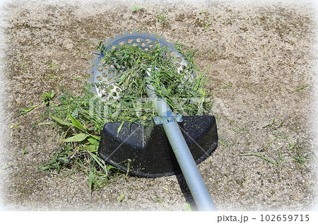 草刈機の刃に草が巻き付いた状態(イラスト風)