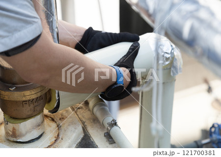 ビルのスプリンクラー設備の点検をするベテランの作業員 ビルメンテナンススタッフ イメージ