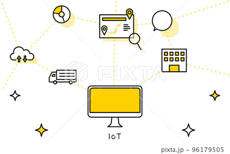 IoTのイメージ、物流システム・生産管理をネットワークを通じて行う仕組みのイメージイラスト