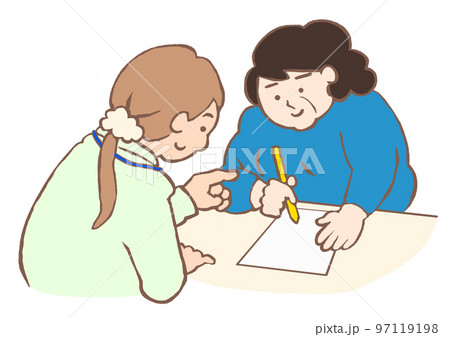 スタッフの説明を聞きながら申請書を記入する中年女性のイラスト