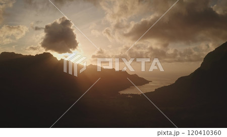Golden sunlight beams streams through clouds, casting a warm glow over mountain silhouette valley and tranquil ocean lagoon. Moorea, French Polynesia, creating a breathtaking tropical sunset panorama