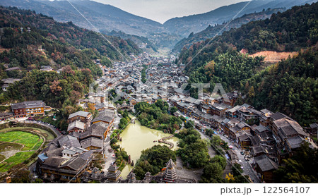 Aerial view of Zhaoxing Dong Village. Valley surrounded by mountains in China