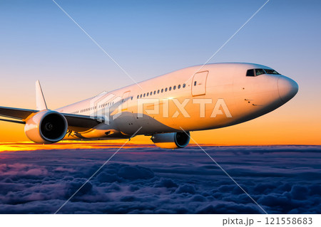 Close-up wide body passenger airplane is flying in the sunrise sky