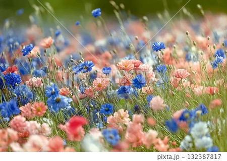 Vibrant Field of Colorful Wildflowers with Pink and Blue Blossoms in Soft Focus Background