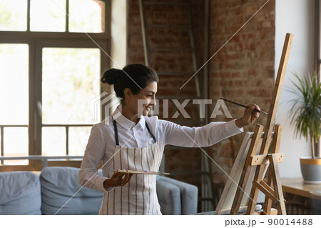 Attractive woman holding paintbrush enjoy creating artwork at home.