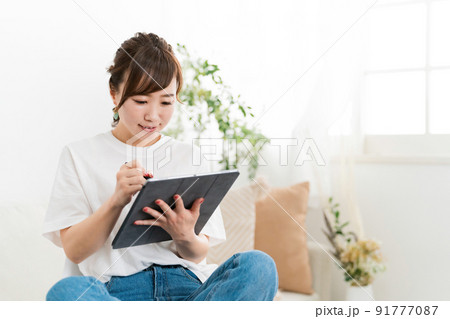 家でタブレットを使う女性(イラストレーター・クリエイター・デザイナー・アニメーター)
