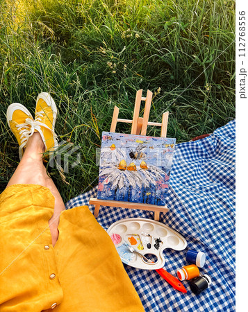 two young and innovative female artists conducting an outdoor painting lesson. Surrounded by nature, they are armed with easels, brushes, and a palette of colors, inspiring each other and their