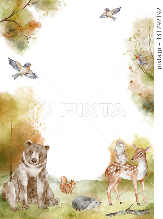 Watercolor card with woodland animals including bear, deer, rabbit, squirrel, hedgehog and birds among autumn trees. Illustration of Forest background template for baby invitations and nursery poster.
