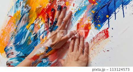 Hands covered in colorful paint smears.