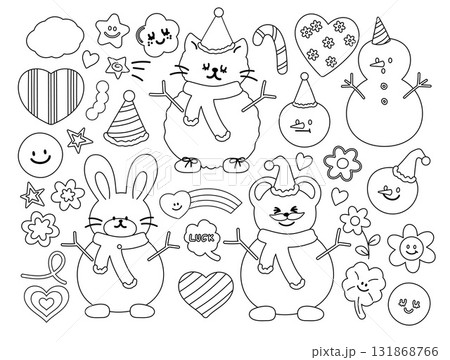 Cute Christmas outlines of cat, teddy bear, bunny wearing winter scarf, snowman, party hat, heart, candy cane, flower for kid colouring book, animal sketch, cartoon character, happy easter, tattoo