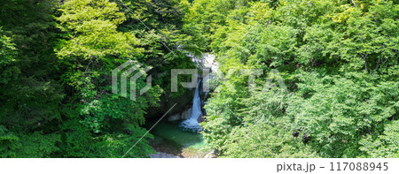 空撮「山梨県」新緑の尾白川渓谷・神蛇滝 北杜市