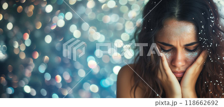 Sad woman with glitter tears among sparkling lights.