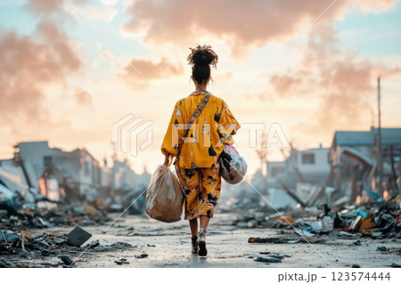 Woman walking through a devastated neighborhood carrying supplies amid a somber atmosphere