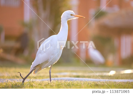White cattle egret wild bird, also known as Bubulcus ibis walking on green lawn in summer