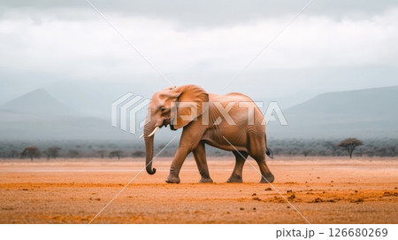 Wild elephant walking gracefully through the savannah of tsavo west national park in kenya, africa, under a cloudy sky, with majestic mountains rising in the background