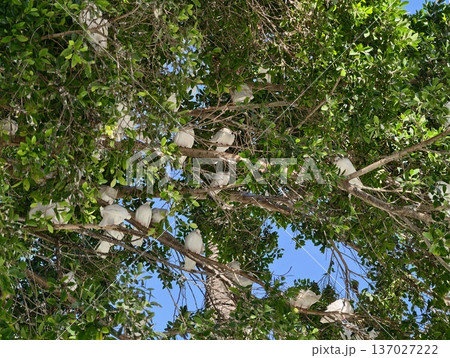Colorful birds gather, Bird colony of white cockatoos thriving among lush leaves in morning sunlight