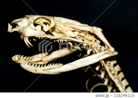 Close up snake head bone on black background