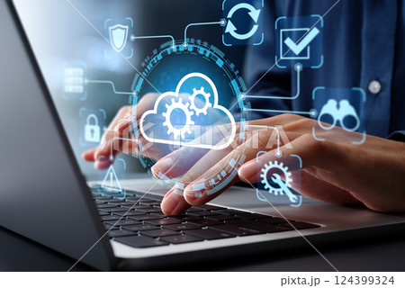 クラウドオートメーションと管理システム。ノートパソコンでクラウドコンピューティングを利用するビジネス