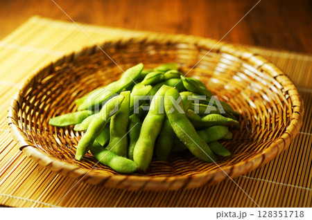 網ざるに盛った塩茹で枝豆