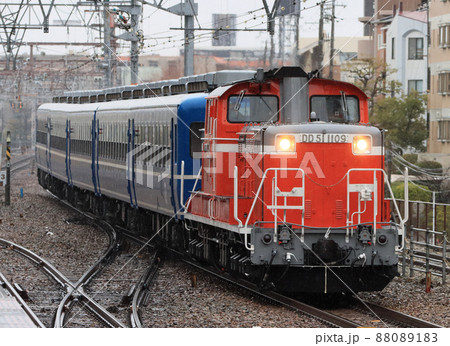 12系客車を牽引して山陽本線・西明石駅付近を走行するDD51ディーゼル機関車