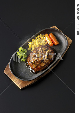 鉄板の上のパセリ、人参グラッセ、コーン、きのこソースの和風ハンバーグステーキを黒背景で俯瞰撮影