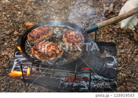 キャンプでハンバーグステーキ hamburger steaks charcoal outdoors