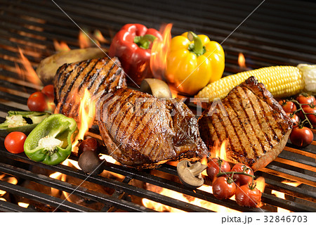 Grilled meat with vegetable on the flaming grill