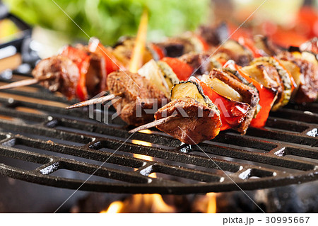 Meat skewer on grill