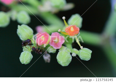 ヤブカラシの花と、その蜜を目当てによって来たアミメアリのアップ