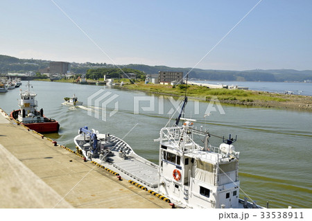 北海道網走市 流氷観光砕氷船おーろら号からの網走川の河口の眺め