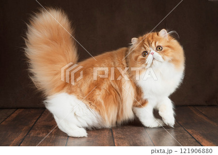 Portrait of a fluffy Persian cat on a dark background. Color: red and white.