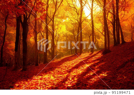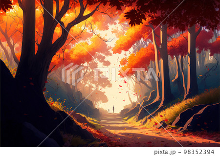 絵画風イラスト 秋 紅葉 山 自然 森 風景