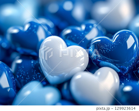 A colorful background filled with many hearts in various shades of blue and white, with a glossy, polished texture.