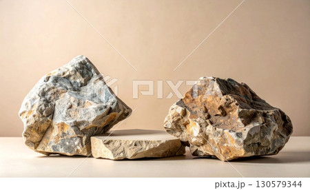 Three Tiered Round Pedestal in Beige Against an Arched Background for Product Display