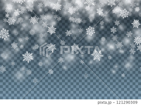 Winter background with various snowflakes on transparent backdrop. Concept of Merry Christmas and Happy New Year holidays. Template for invitations, congratulations, advertisements vector illustration