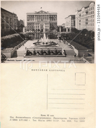 Moscow, Russia - circa 1952: Postcard and back of a retro postcard. The Mossovet building. Retro postcard. Inscriptions in Russian.