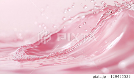 A vibrant splash of clear water creates a dynamic wave and delicate droplets on a calm, reflective pink surface, highlighting its translucent beauty.